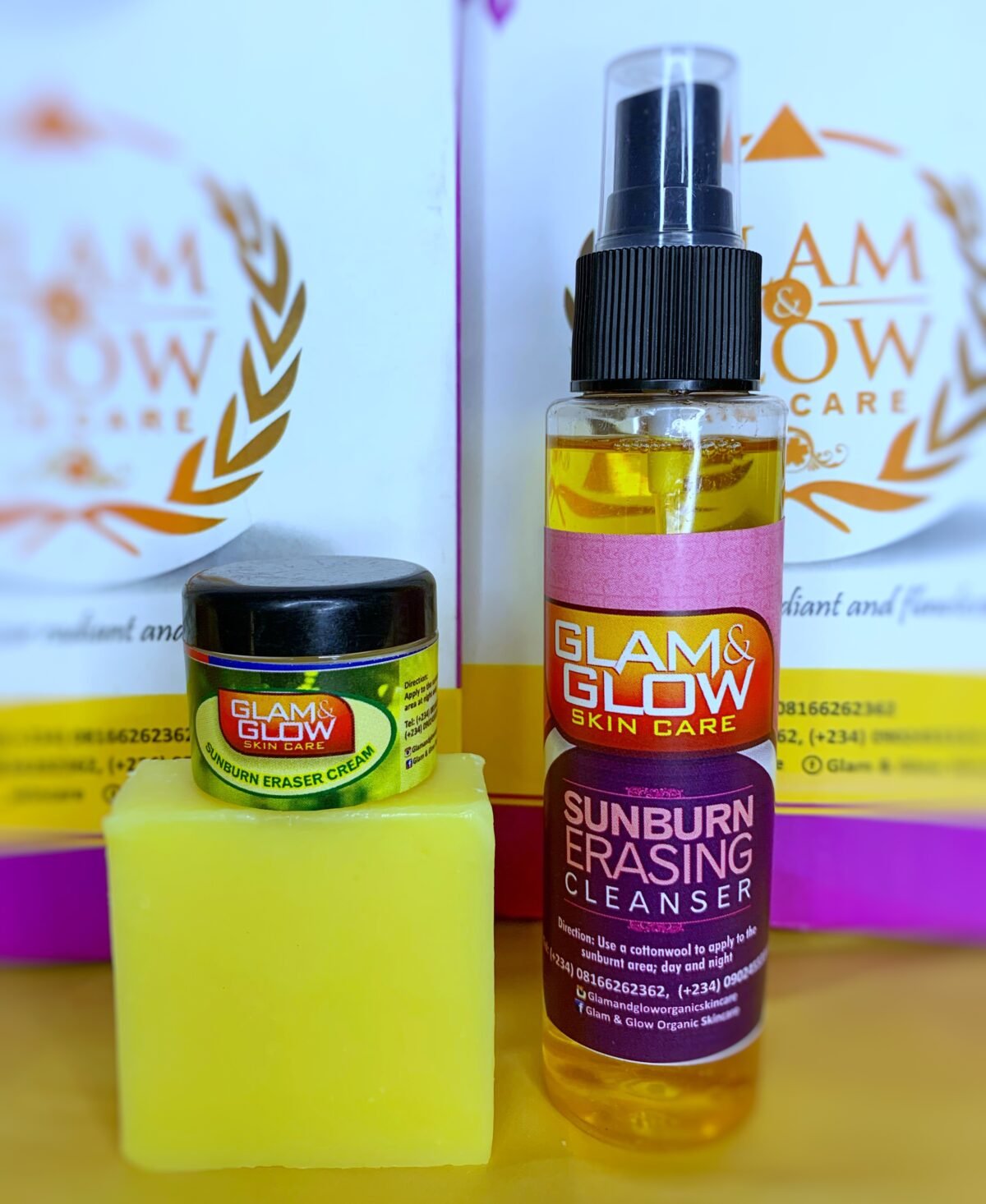 It contains Sunburn erazer cream, Sunburn erazer cleanser and brightening face soap